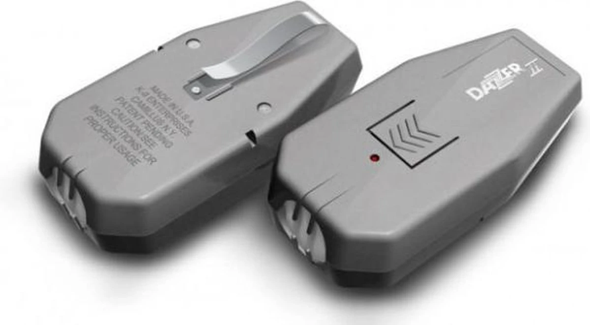 Het zendertje van de Dazer werkt op een vervangbare 9 volt alkaline batterij. Deze is goed voor ruim 1000 keer een signaal ofwel 3 Ã 4 jaar gebruik. Vaak nog langer. De Dazer zelf gaat veel langer mee. De Dazer is made in de USA en weegt slechts 122 gram inclusief batterij en bevestigingsclip en is 11 cm lang, 5cm breed en 3 cm dik.