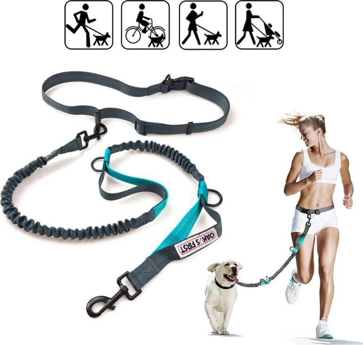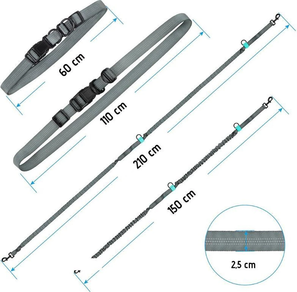Deze set bestaat uit een riem met een lijn die je aan de halsband van jouw hond vastklikt. Zo blijft jouw hond altijd in de buurt en heb je toch je handen vrij. De lijn zit bovendien met een haak met kogelgewricht vast om te voorkomen dat de lijn in de knoop raakt en er zijn twee schokdempers in de riem. Deze zorgen ervoor dat er flexibiliteit en comfort is tijdens het uitlaten. De set is voorzien van reflecterende stiksels, zo ben je zelfs in het donker ook goed zichtbaar. Het is heel eenvoudig om de heupriem af te stellen op de juiste maat.